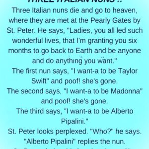At the Pearly Gates, three Italian nuns arrived together after long, faithful lives. St. Peter greeted them warmly and smiled. “Sisters,” he said, “you lived with kindness…