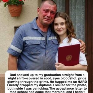 My dad showed up to my graduation straight from work—filthy uniform, soot-covered boots, bloodshot eyes—and wrapped me in a bear hug, leaving a greasy handprint on my…
