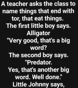 A teacher asks the class to name things that end with “tor” and eat things. The first boy says, “Alligator.” The teacher responds, “Very good, that’s a big word.” The second boy says, “Predator,” and the teacher agrees, “Well done.”