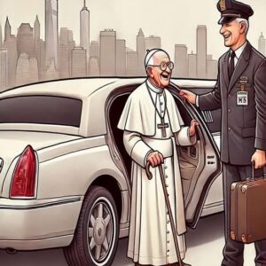 An elderly Pope landed in New York City, not to a grand procession but to a waiting limousine. As he approached, a mischievous glint lit his eyes….