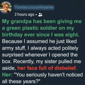 Starting on my eighth birthday, Grandpa Henry began giving me the same strange gift every year — a single green plastic soldier, wrapped in old newspaper, no…