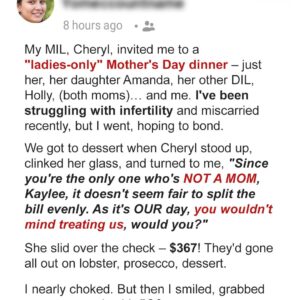 motherhood felt like a dream slipping further away. Still, I went to Cheryl’s “ladies-only” Mother’s Day dinner—just me, my MIL, and my two sisters-in-law, both of whom…