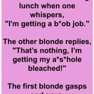 Two blondes are having lunch. One whispers, “I’m getting a boob job.” The other replies, “That’s nothing, I’m getting my arsehole bleached!”First blonde gasps, “Oh wow! I…
