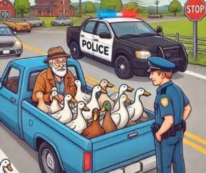A policeman was patrolling downtown when he spotted an old man driving a rusty pickup truck with the bed absolutely overflowing with ducks. They were waddling, quacking,…