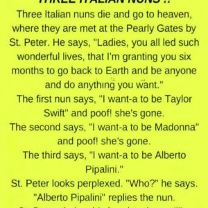 At the Pearly Gates, three Italian nuns arrived together after long lives devoted to service and prayer. St. Peter greeted them warmly and praised their kindness, humility,…
