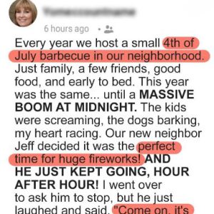 Every year, I host a quiet 4th of July barbecue for friends and family. But this time, our new neighbor, Jeff, had other plans. Just after midnight,…